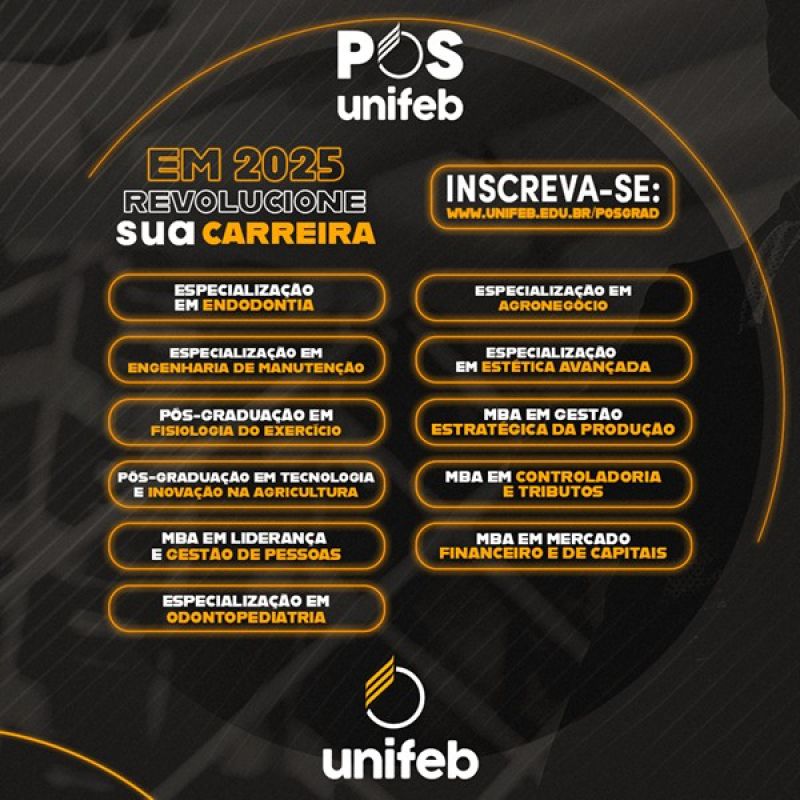 Barretos, 30 de janeiro de 2025 - O UNIFEB (Centro Universitário da Fundação Educacional de Barretos) acaba de anunciar o lançamento de 11 cursos de pós-graduação voltados para diferentes áreas do conhecimento, reafirmando seu compromisso com a formação continuada de alta qualidade.