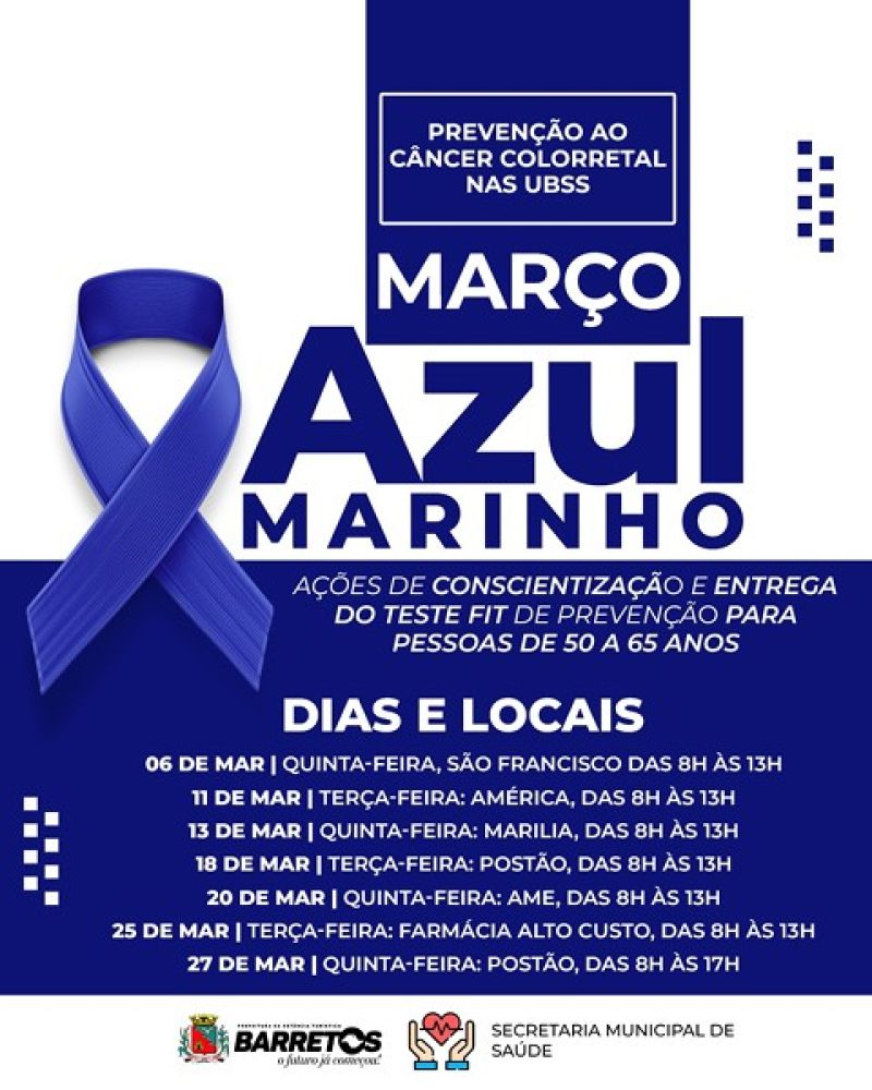 Integrando a Campanha Março Azul-Marinho de prevenção ao câncer colorretal, a equipe de prevenção do Hospital de Amor realiza ao longo deste mês ações de conscientização sobre hábitos saudáveis para prevenir a doença e faz a entrega do teste imunoquímico fecal (FIT). Nesta quinta-feira, 13, das 8 às 13h, na UBS Marília, o teste é entregue gratuitamente para homens e mulheres entre 50 e 65 anos que não tenham feito exame de colonoscopia ou de retossigmoidoscopia nos últimos cinco anos e não tenham histórico de doença inflamatória intestinal e de pólipos colorretais.