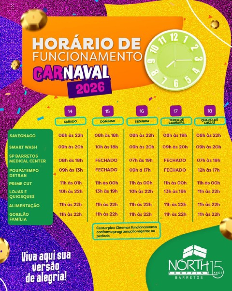No período carnavalesco o North Shopping Barretos terá o horário de funcionamento, conforme arte em anexo.