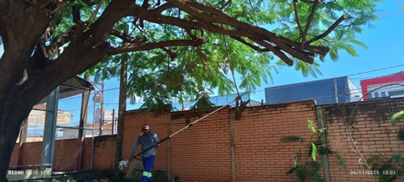 Outra equipe realizou manutenções no prédio da Fatec, localizado na região central. Foi feita a poda de árvores e a retirada de um tronco, que estava dentro da unidade.