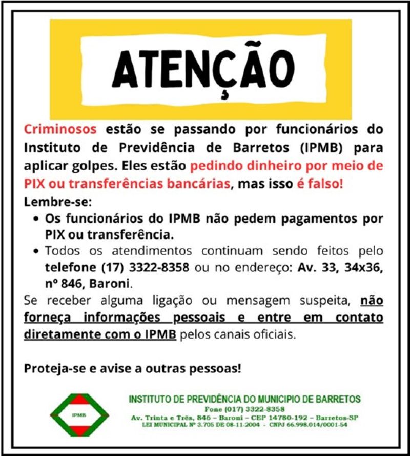 O Instituto de Previdência do Município de Barretos (IPMB) emitiu um alerta sobre tentativas de golpe em face de aposentados e pensionistas do município. Segundo o apurado, criminosos estão tentando se passar por funcionários da autarquia pedindo dinheiro, por meio de PIX ou transferências bancárias.