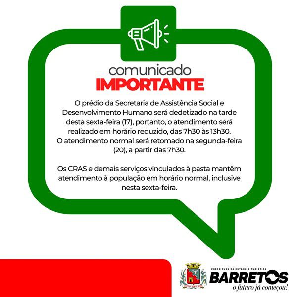 Atendimento na sede da Assistência Social nesta sexta-feira, 17, será até as 13h30